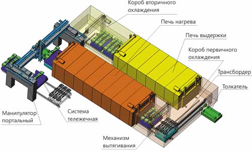 Комплекс термообработки железнодорожного литья позволяет осуществлять процесс термообработки литых заготовок (рама боковая и балка надрессорная) для выравнивания химической неоднородности и размеров зерна, получения механических свойств, регламентируемых ОСТ-32-183-2001.