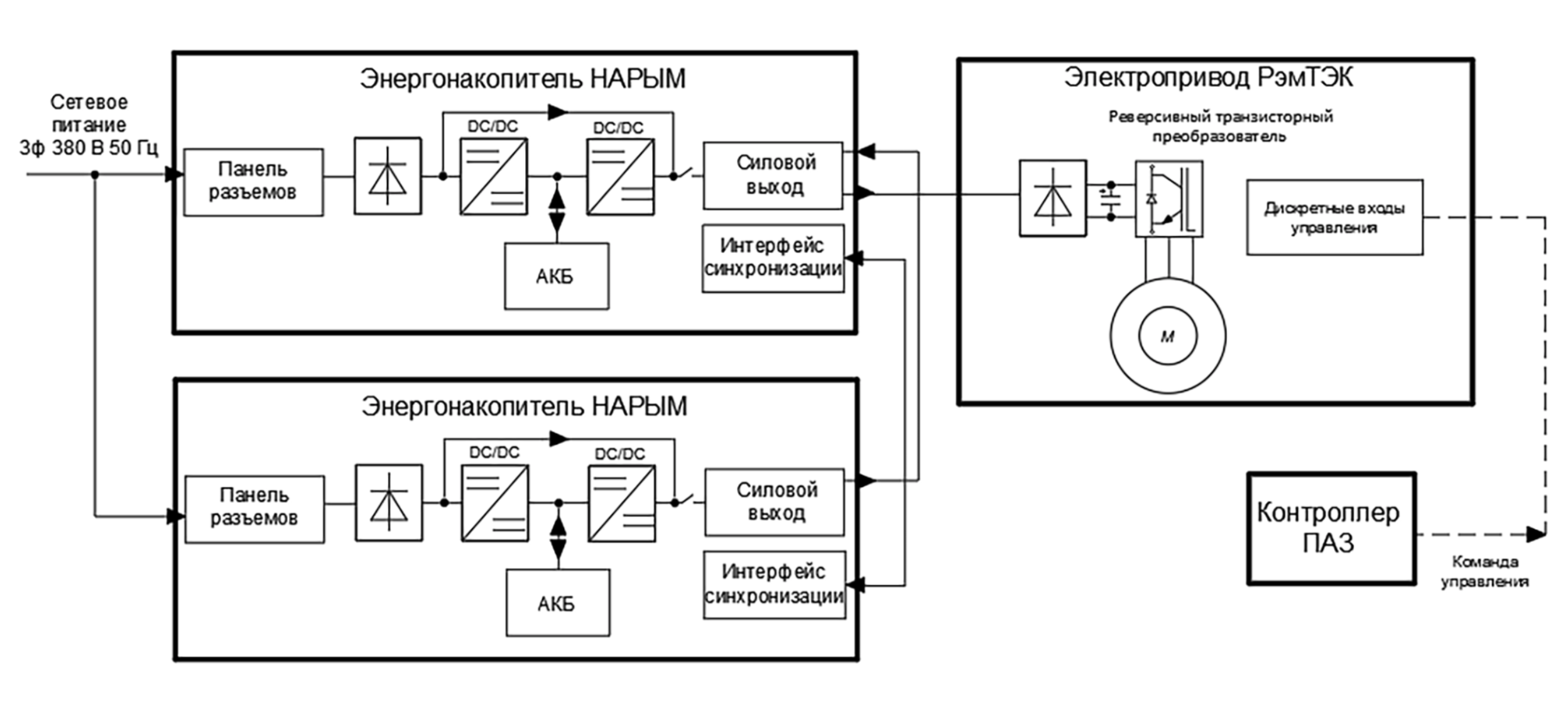 Параллельное соединение энергонакопителей НАРЫМ для питания электропривода РэмТЭК мощностью более 3 кВт