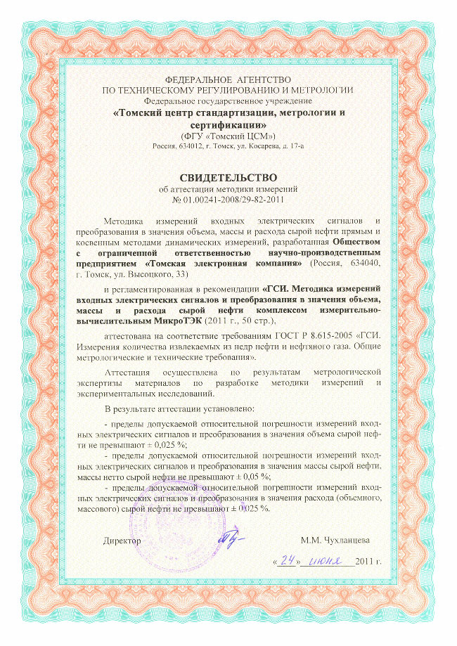 Свидетельство об аттестации методики измерений объема, массы и расхода сырой нефти ИВК МикроТЭК