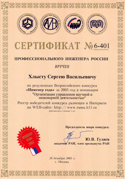 По результатам Всероссийского конкурса "Инженер года" за 2005 год в номинации "Организация управления научной и инженерной деятельностью" техническому директору НПП "ТЭК" Хлысту Сергею Васильевичу вручен Сертификат "Профессионального инженера России".