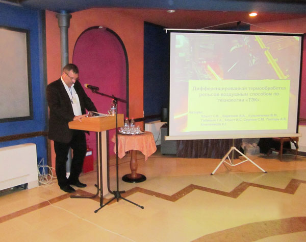 Технический директор компании Хлыст С. В. и специалисты Кузьмиченко В. М., Гонтарь А. В. представили на заседании доклад на тему "Дифференцированная термообработка рельсов воздушным способом по технологии "ТЭК".