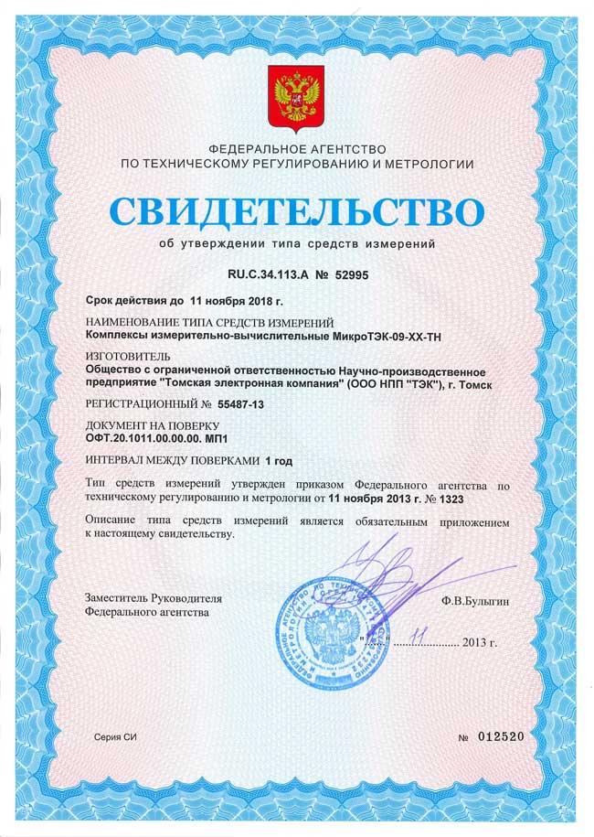 Свидетельство об утверждении типа средства измерения Комплексов измерительно-вычислительных МикроТЭК-09-XX-ТН