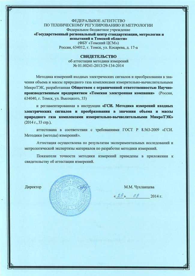 Свидетельство об аттестации методики измерений входных электрических сигналов и преобразования в значения объема и массы природного газа ИВК МикроТЭК
