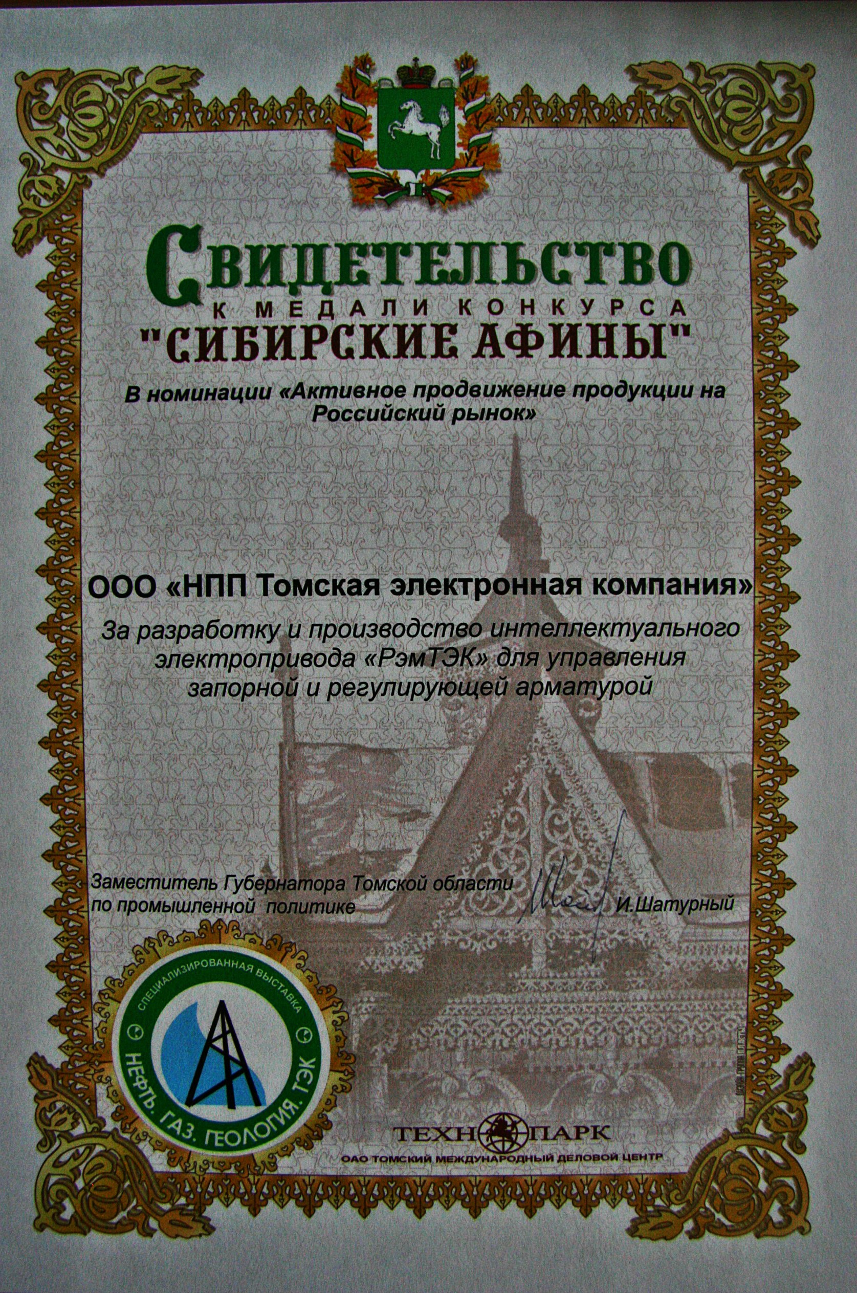 По итогам выставки НПП «ТЭК» победил в конкурсе «Сибирские Афины» в номинации «Активное продвижение продукции на Российский рынок». Награда досталась компании за разработку и производство интеллектуального электропривода РэмТЭК для управления запорной и регулирующей арматурой.
