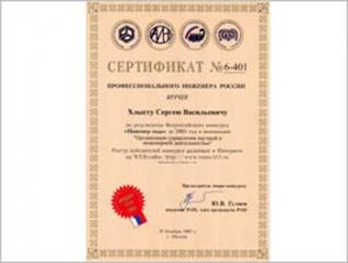 По результатам Всероссийского конкурса "Инженер года" за 2005 год в номинации "Организация управления научной и инженерной деятельностью" техническому директору НПП "ТЭК" Хлысту Сергею Васильевичу вручен Сертификат "Профессионального инженера России".