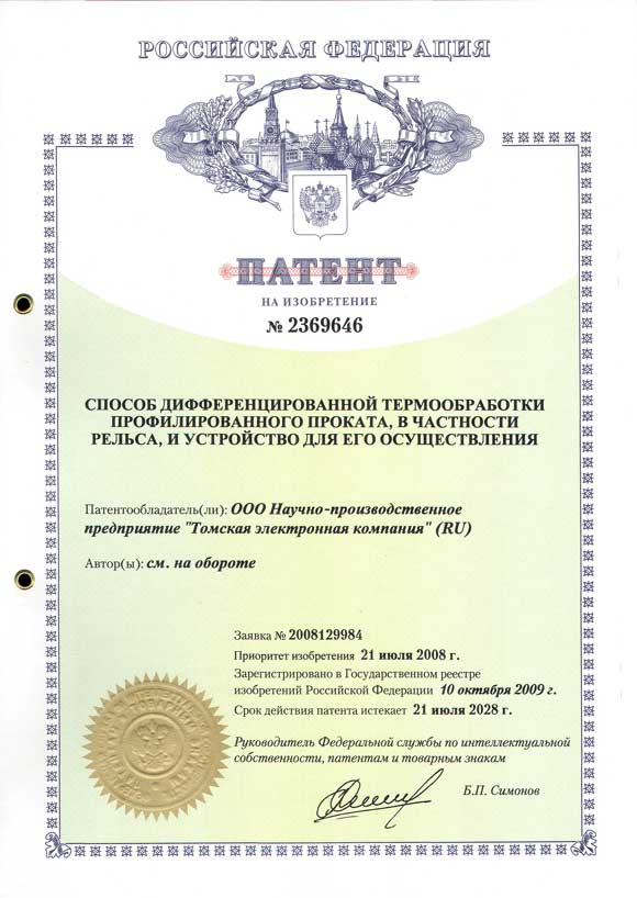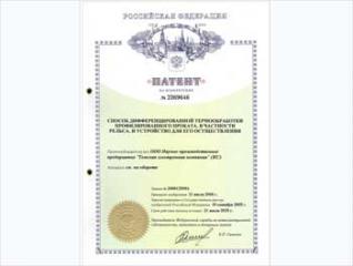 Получен патент на изобретение № 2369646 "Способ дифференцированной термообработки профилированного проката, в частности рельса, и устройство для его осуществления".