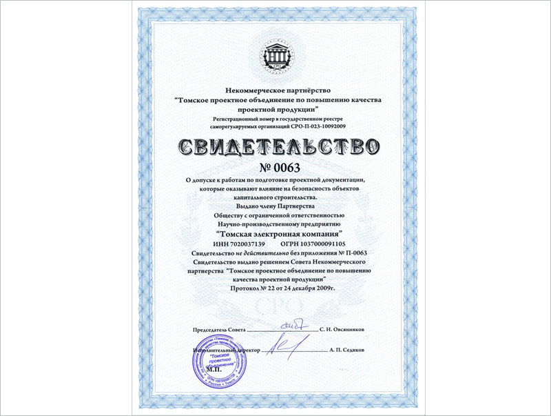 "Томская электронная компания" определилась в выборе саморегулируемой организации и принята в состав членов некоммерческого партнерства "Томское проектное объединение" (СРО).