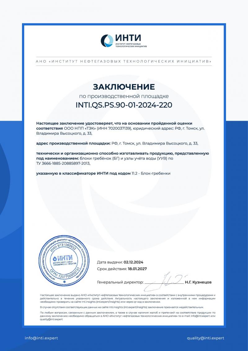 Заключение ИНТИ по производственной площадке