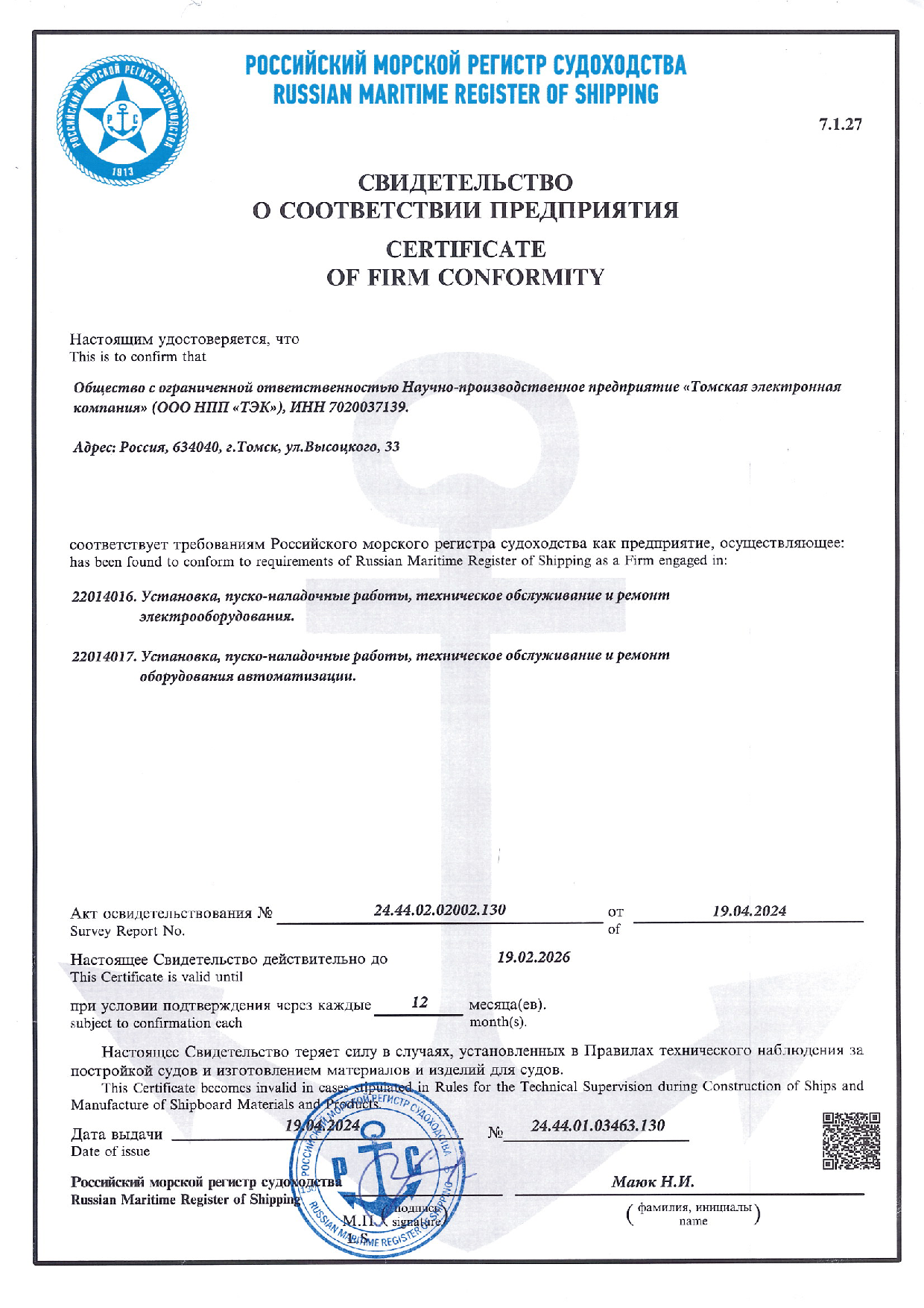 Сидетельство о соответствии предприятия требованиям РМРС